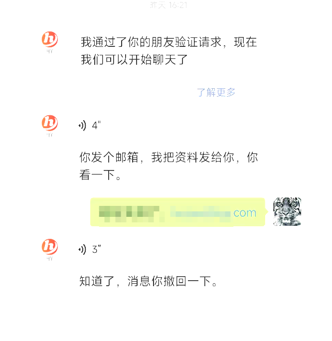 扫码秒过,然后不等老胡开口就主动发来一段语音,让老胡留信箱。